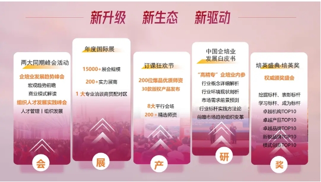 作为培训行业资源链接的桥梁和纽带,【培博会】一直秉承着“中国智慧 世界输出”的使命,将国内外知名培训机构、领先的培训产品、创新技术、解决方案和咨询供应商、优质讲师聚集在一起。每年都吸引来10000+机构首脑和2000多名人才发展从业者,现场1200+主流产品集中展示,为行业突破、产品迭代和技术创新搭建交流平台,为培训行业上下游助力赋能。