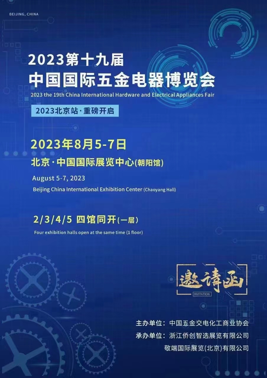 2023第十九届中国国际五金电器博览会 参展联系:刘洋18511896383 THE 19TH CHINA INTERNATIONAL HARDWARE AND ELECTRIC FAIR 2023年08月05-07日 北京.中国国际展览中心(朝阳馆) 】组织机构 【主办单位】中国五金交电化工商业协会 【协办单位】中国家用电器商业协会 【承办单位】北京金益友联展览有限公司 敬端国际展览(北京)有限公司 浙江侨创智选展览有限公司