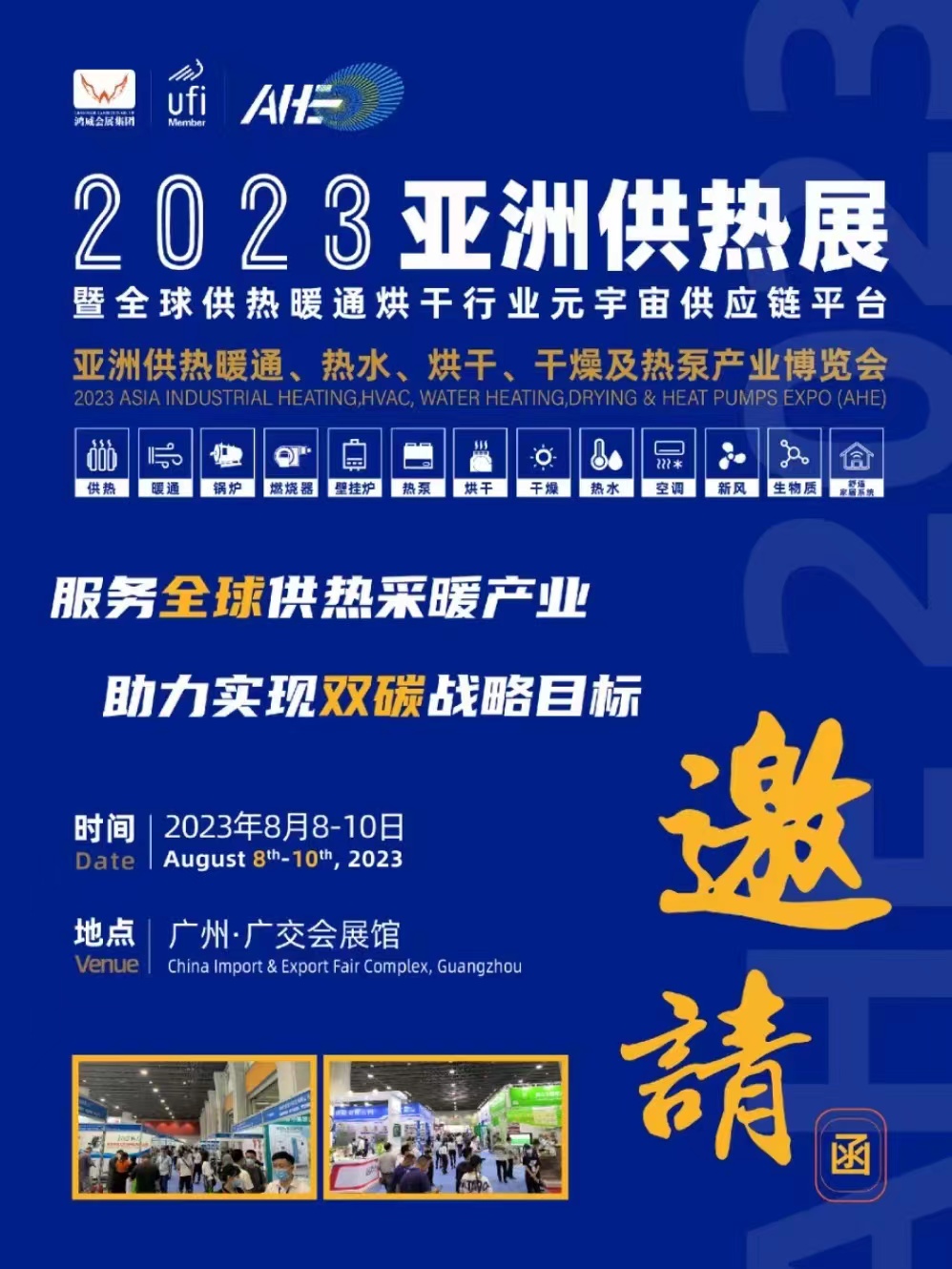 2023亚洲供热展 暨供热暖通烘干行业元宇宙供应链平台 亚洲供热暖通、热水、烘干、干燥及热泵产业博览会 Asia Industrial Heating, HVAC, Water Heating, Drying & Heat Pumps Expo (AHE) 时间:2023年8月8-10日 地点:广州·广交会展馆 August 8rd-10th, 2023 China Import & Export Fair Complex, Guangzhou 供热|暖通|锅炉|燃烧器|壁挂炉|热泵|热水|烘干|干燥|泵阀|空调|新风|舒适家居系统 服务全球供热采暖产业 助力实现双碳战略目标