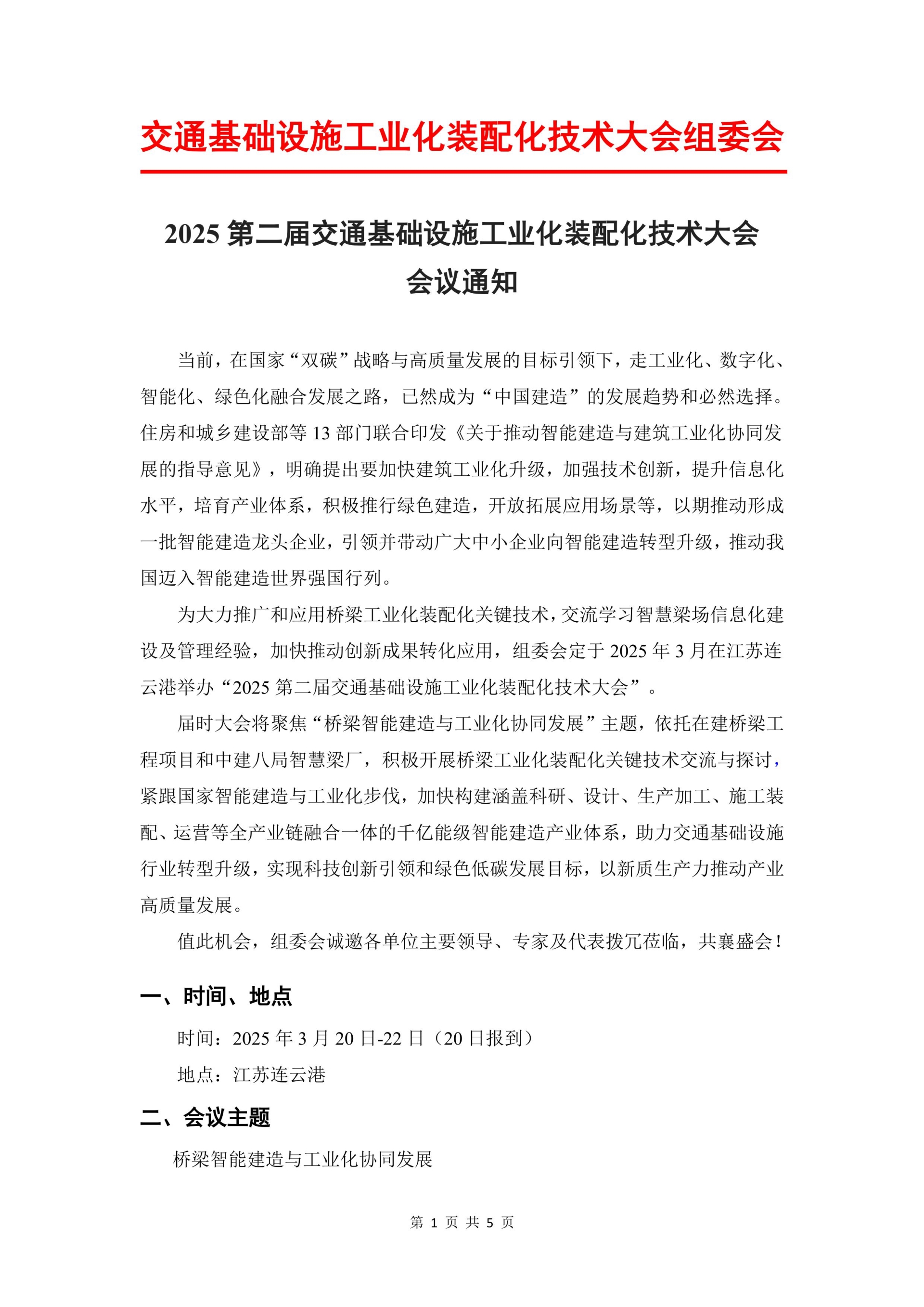 为大力推广和应用桥梁工业化装配化关键技术,交流学习智慧梁场信息化建设及管理经验,加快推动创新成果转化应用,组委会定于2025年3月在江苏连云港举办“2025第二届交通基础设施工业化装配化技术大会”。